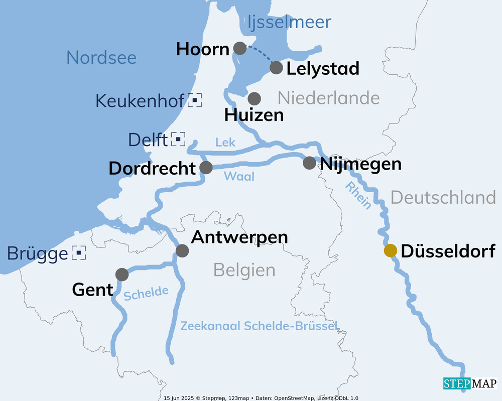 ○ Hollands Blütenzauber – Ausflug zum Keukenhof ○ Auf den Spuren der Seefahrer – Hoorn entdecken ○ Porzellan & Geschichte – ein Tag in Delft ○ Antwerpen hautnah – Altstadt und Bahnhofspracht ○ Nijmegen – Die älteste Stadt der Niederlande