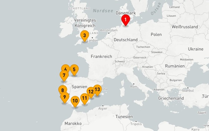 Der rot-weiße Leuchtturm der Isle of Portland begrüßt Sie schon aus der Ferne und geleitet Sie durch den Ärmelkanal. Kurzerhand in den Atlantik eingebogen, empfängt Sie Gijóns Panorama bevor Sie ein Stück auf dem Jakobsweg wandern, durch Lissabon mit der Tram fahren oder mit dem Jeep durch das Hinterland der Algarve. Beeindruckt stehen Sie auf dem Felsen von Gibraltar, estaunen die maurischen Festungen Alcazaba in Almeria oder das Castillo dArgos Hotel